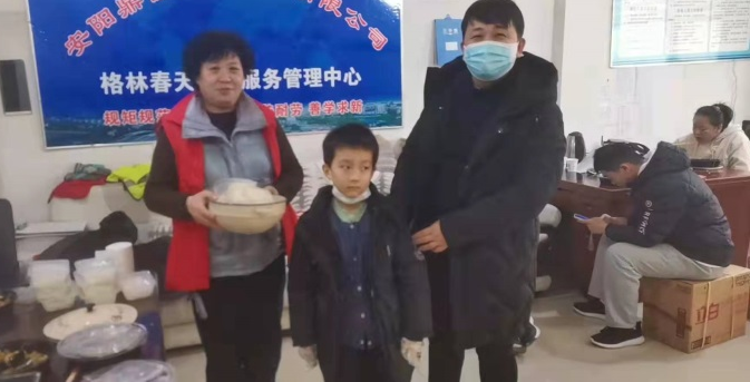 1月16日晚上6時,格林春天項目部辦公室突然來了幾名業(yè)主。他們有的端著鍋,有的拎著袋子,辦公室工作人員張玉青還沒反應(yīng)過來,業(yè)主們已將手中的東西放了一大桌子,袋子里熱乎乎的飯菜香味在空氣中彌漫,綠白相間的蔬菜花卷兒、酸湯皮渣、酥肉丸子、油炸花生米、炒蔬菜、一大鍋米飯,還有一只畫寶剛燒雞,真是豐盛······