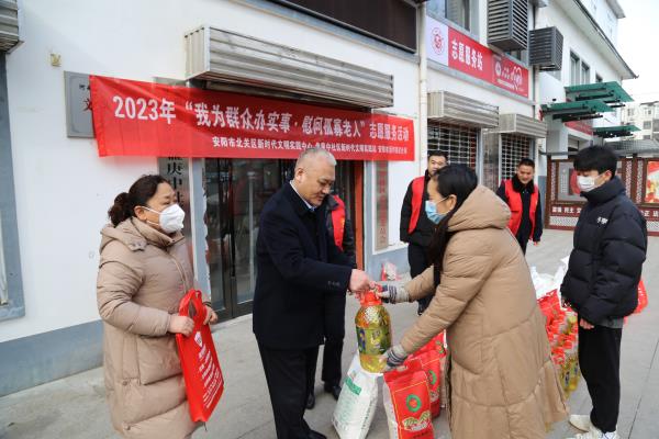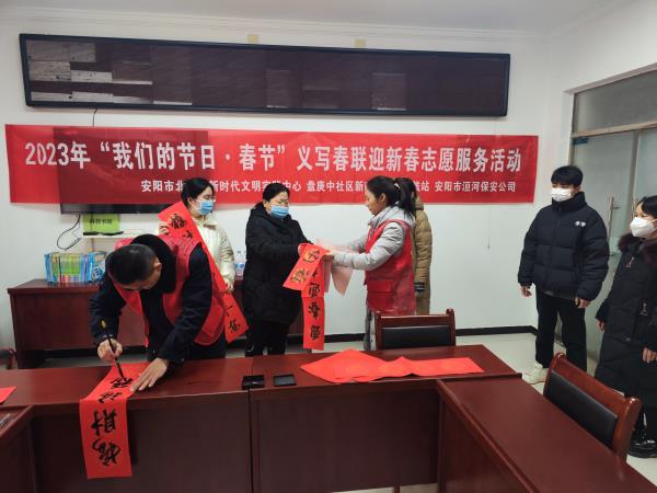 為進(jìn)一步了解基層群眾的需求,切實(shí)解決他們在生活中的實(shí)際問題,讓他們度過一個溫暖、祥和、快樂的新春佳節(jié)。1月17日下午,公司總經(jīng)理魏東帶領(lǐng)志愿者帶著米、面、油、春聯(lián)等深入盤庚中社區(qū)開展了“義寫春聯(lián)迎新春”暨“我為群眾辦實(shí)事慰問孤寡老人”志愿服務(wù)活動。
