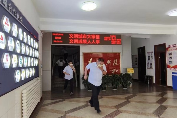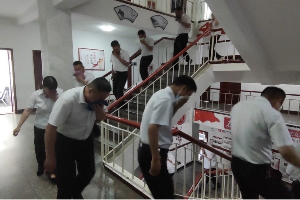 隨著急促的警報聲響起,消防演練拉開序幕。所有職工有序開展逃生活動,用濕毛巾捂住口鼻,低頭彎腰,按路線向應(yīng)急疏散口疏散。全體職工在一分多鐘內(nèi)迅速撤離至安全區(qū)域。