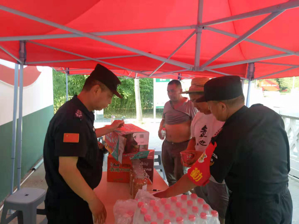 由于高溫干旱,防火成為糧庫(kù)的首要工作。保安員犧牲休息時(shí)間配合中儲(chǔ)糧,聯(lián)合公安、消防等部門(mén)開(kāi)展消防安全大檢查并開(kāi)展消防安全演練,增強(qiáng)了消防安全意識(shí),提升了消防滅火能力。為確保出入糧庫(kù)車(chē)輛有序、安全,隊(duì)員每天早來(lái)晚歸,維護(hù)糧庫(kù)大門(mén)口秩序。看到糧農(nóng)排隊(duì)售糧,保安班長(zhǎng)馮秋森安排隊(duì)員架設(shè)愛(ài)心涼亭,擺放愛(ài)心座椅, 備足熱水、礦泉水等防暑降溫用品,讓糧農(nóng)使用,防止中暑。他們又準(zhǔn)備了方便面分發(fā)到糧農(nóng)手中,解決他們的用餐。
