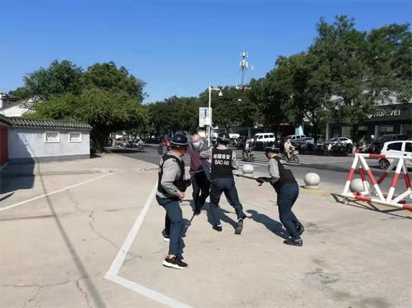 一名“恐暴”分子到學(xué)校門崗尋釁滋事,與門崗保安隊員發(fā)生沖突,暴徒手持菜刀闖進校園。學(xué)校兩名保安手持鋼叉、盾牌與恐暴分子發(fā)生對峙,另一名保安按響了一健報警裝置,110指揮中心接到報警后,立即出動警力趕赴現(xiàn)場,學(xué)校保安和民警協(xié)同作戰(zhàn),成功將闖入校園的暴恐“歹徒”制服。整個演練過程緊湊、嚴肅逼真,受到了學(xué)校和派出所領(lǐng)導(dǎo)的表揚。