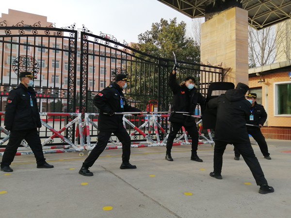 上午9時(shí)30分,在疫情防控期間,兩名社會(huì)人員不戴口罩要強(qiáng)行進(jìn)入安陽(yáng)第五中學(xué)校園,保安員對(duì)其進(jìn)行勸阻。但兩人不聽(tīng)勸告,手持鋼管要沖進(jìn)學(xué)校,并揚(yáng)言用爆炸物威脅。我保安員立刻啟動(dòng)防暴防恐應(yīng)急預(yù)案。隊(duì)員拿起鋼叉、橡膠棒、防暴盾牌等安保器械與“暴徒”勇敢的搏斗,逐步壓縮暴恐分子活動(dòng)范圍,并在工學(xué)院中隊(duì)的配合下將兩人制服。