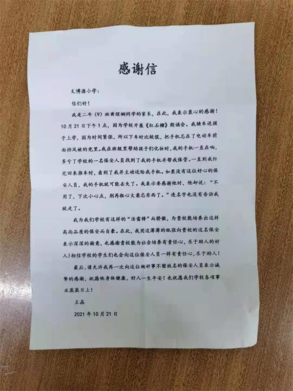雖然趙海利不肯告訴王晶他的名字,也沒(méi)有說(shuō)他是洹河保安的隊(duì)員,但她卻記住了這個(gè)“活雷鋒”,并特意給學(xué)校送來(lái)了感謝信。洹河保安公司隊(duì)員趙海利高度負(fù)責(zé)、為群眾著想的高尚品格在學(xué)校傳為了佳話。