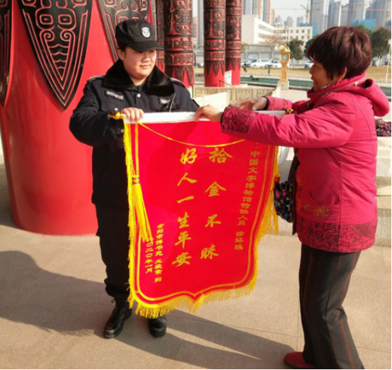 “感謝特保隊(duì)員,你們的品德太高尚了,你們讓我相信了還是好人多。”2020年1月1日,家住博書苑的王愛素女士一看到特保大隊(duì)派駐在中國(guó)文字博物館的隊(duì)員徐環(huán)琪,便激動(dòng)地說出這番話,并將一面寫有“好人一生平安,拾金不昧”的錦旗,送到徐環(huán)琪手中。這是怎么一回事呢?