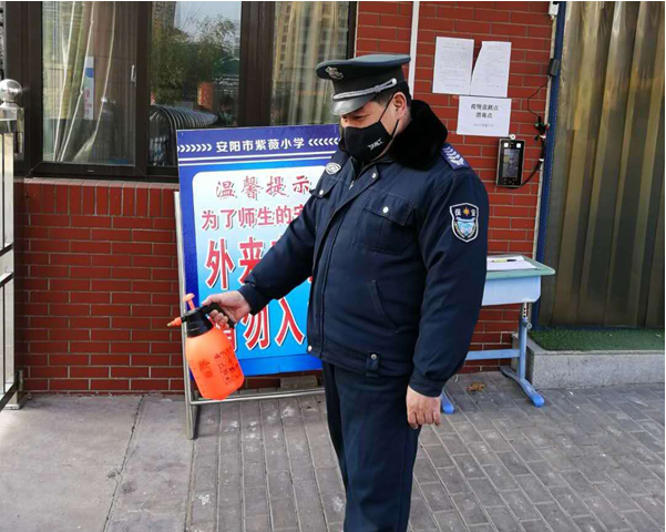 疫情發(fā)生后,人防一大隊(duì)80名校園保安按照公司、大隊(duì)和學(xué)校領(lǐng)導(dǎo)要求始終戰(zhàn)斗在抗疫工作前沿。在這場看不見硝煙的戰(zhàn)疫中涌現(xiàn)出許多沖鋒陷陣、主動(dòng)協(xié)助學(xué)校開展防疫工作的保安隊(duì)員。紅廟街小學(xué)保安班長袁和平,每天除了做好本職工作,對進(jìn)入校園的人員測量體溫,認(rèn)真登記,守好學(xué)校防控疫情的首道防線外,還主動(dòng)給學(xué)校校園和辦公室噴灑消毒液。無論白天與黑夜,只要客戶需要,他都隨叫隨到,為學(xué)校防控疫情工作做出自己的貢獻(xiàn)。