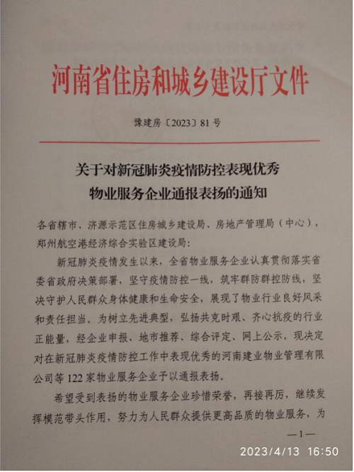 4月8日,河南省住房和城鄉(xiāng)建設(shè)廳通報表揚了全省新冠肺炎疫情防控工作表現(xiàn)優(yōu)秀的122家物業(yè)服務(wù)企業(yè),安陽鼎誠物業(yè)服務(wù)有限公司榜上有名。