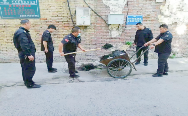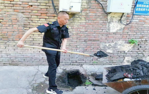 董偉得知情況后,立即組織隊(duì)員趕往現(xiàn)場(chǎng)進(jìn)行查看,經(jīng)排查發(fā)現(xiàn)污水外溢是由后院下水道沉淀池堵塞,造成營(yíng)業(yè)廳污水難以排放。為徹底整治下水道堵塞這一“頑疾”,董偉安排水冶本地隊(duì)員從家里拿來(lái)鐵揪、手推車等工具,組織隊(duì)員對(duì)沉淀池進(jìn)行徹底清理。當(dāng)翻開(kāi)沉淀池窨井蓋時(shí),面對(duì)臭氣熏天的淤泥,隊(duì)員們沒(méi)有絲毫的退縮,頂著刺鼻的氣味,大家一起動(dòng)手,將堵塞的淤泥、樹(shù)葉、生活垃圾等集中用推車清運(yùn)拉走。下水道疏通后,隊(duì)員又提水把周圍污染的路面清洗干凈。下水道通了,路面也干凈了,大家的心情也舒暢了。