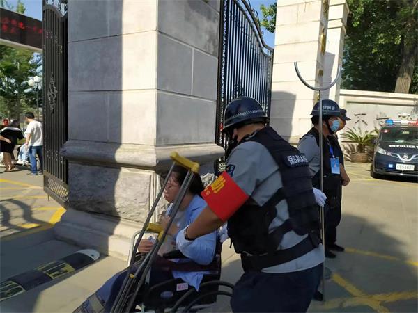 期間,一名開高的考生,因腿受傷不能行走,家長用車子送至一中大門口。保安班長王鳳銀見狀后,主動跟家長和學(xué)校溝通后,帶領(lǐng)隊員接過了護(hù)送該考生進(jìn)入考場的任務(wù)。他們用一中的輪椅,把考生送至考場外,聯(lián)系老師送至考場內(nèi),考試結(jié)束后,再把考生接出送至大門口。