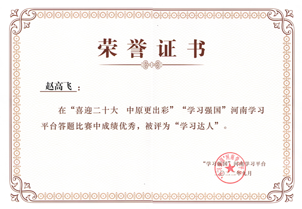 對(duì)于平時(shí)怎樣學(xué)習(xí),趙高飛有自己的學(xué)習(xí)心得,他認(rèn)為,學(xué)習(xí)要貴在勤奮、貴在鉆研、貴在有恒,每天早上第一件事,就是打開學(xué)習(xí)強(qiáng)國(guó)平臺(tái),翻閱感興趣的時(shí)事新聞和行業(yè)動(dòng)態(tài),完成每天的學(xué)習(xí)任務(wù),從不占用工作時(shí)間學(xué)習(xí),都是在上班之前就完成了。對(duì)于參加比賽如何獲得好的成績(jī),趙高飛有一套自己的學(xué)習(xí)竅門。一是要堅(jiān)持,每天堅(jiān)持把當(dāng)日學(xué)習(xí)積分做完,總結(jié)學(xué)習(xí)方法和學(xué)習(xí)技巧。二是勤練習(xí),四人賽、雙人對(duì)戰(zhàn)是關(guān)鍵,要勤練習(xí)各個(gè)答題模塊,熟能生巧。三是有訣竅,他整理出一整套學(xué)習(xí)題庫(kù)達(dá)5000多題,并利用碎片時(shí)間翻看熟記于心,他把各種類型的題分類總結(jié),錯(cuò)題、易錯(cuò)題收藏起來,反復(fù)練習(xí)、各個(gè)擊破,最終,他克服一切困難,集中一切精力用5個(gè)小時(shí)時(shí)間,通關(guān)“強(qiáng)國(guó)總題庫(kù)”共4202題。四是重交流,他加入了“學(xué)習(xí)強(qiáng)國(guó)”全國(guó)學(xué)習(xí)聯(lián)盟、“學(xué)習(xí)強(qiáng)國(guó)”河南學(xué)習(xí)聯(lián)盟等學(xué)習(xí)微信群,和學(xué)習(xí)達(dá)人們一起探討答題經(jīng)驗(yàn)和技巧