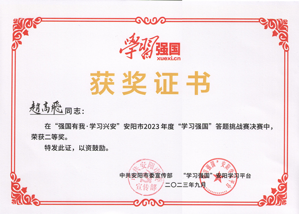 趙高飛,35歲,中共黨員,本科學(xué)歷,現(xiàn)任鼎信子公司副經(jīng)理,自“學(xué)習(xí)強(qiáng)國(guó)”平臺(tái)上線以來,趙高飛學(xué)習(xí)成績(jī)屢創(chuàng)新高,先后榮獲2020年度學(xué)習(xí)強(qiáng)國(guó)挑戰(zhàn)賽安陽(yáng)市賽區(qū)決賽“個(gè)人三等獎(jiǎng)”,2021年度安陽(yáng)市黨員干部在線答題競(jìng)賽“個(gè)人三等獎(jiǎng)”,2022年度學(xué)習(xí)強(qiáng)國(guó)河南學(xué)習(xí)平臺(tái)“喜迎二十大、中原更出彩”答題比賽“周達(dá)人”及“學(xué)習(xí)達(dá)人”,2023年度“強(qiáng)國(guó)有我 學(xué)習(xí)興安”學(xué)習(xí)強(qiáng)國(guó)答題挑戰(zhàn)賽安陽(yáng)市決賽“個(gè)人二等獎(jiǎng)”,2023年度學(xué)習(xí)強(qiáng)國(guó)河南學(xué)習(xí)平臺(tái)“貫徹二十大精神、建設(shè)現(xiàn)代化河南”強(qiáng)國(guó)答題比賽“周達(dá)人”。學(xué)習(xí)從來都不是一蹴而就的,這些成績(jī)的獲得,是趙高飛日積月累堅(jiān)持學(xué)習(xí)的成果。