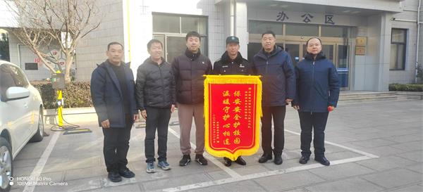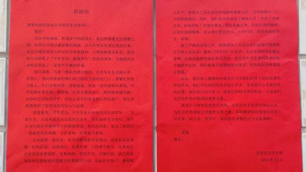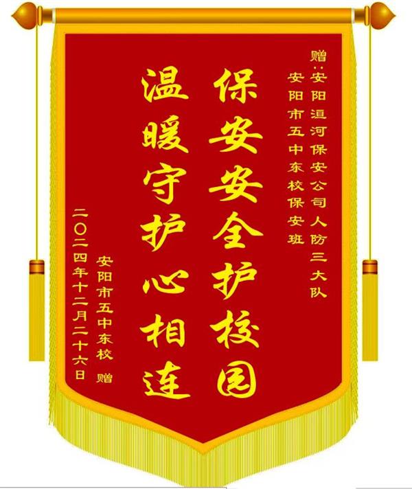 12月27日上午10時許,安陽市五中東校有關(guān)領(lǐng)導(dǎo)專程將一面寫有“保安安全護校園 溫暖守護心相連”的錦旗和一紙表揚信送到公司,感謝公司人防三大隊派駐學(xué)校保安班一直以來對維護校園平安所作出的辛勤努力和付出,營造了安全、有序、文明、和諧的環(huán)境,為構(gòu)筑平安和諧校園作出了重要貢獻。