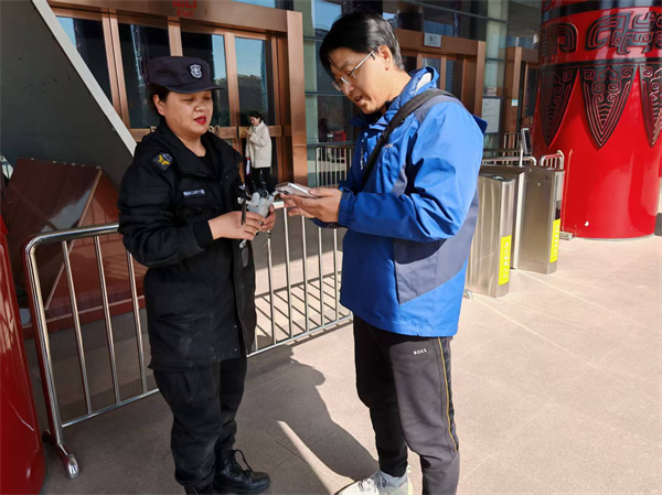 原來事情是這樣的。2月15日午時(shí),趙書娜巡邏時(shí)發(fā)現(xiàn)廣場(chǎng)上空有無人機(jī)飛行,便立即尋找無人機(jī)操控人員,當(dāng)巡查到宣文館喂鴿子處時(shí),發(fā)現(xiàn)有一名游客正在操控?zé)o人機(jī),趕忙上前勸阻。這時(shí)無人機(jī)剛好電量低掉落在高數(shù)十米的宣文館平臺(tái)上,該游客情緒有點(diǎn)波動(dòng),請(qǐng)求工作人員將其撿回。趙書娜隨即聯(lián)系中隊(duì)長(zhǎng),向館方上報(bào)情況后取來備用鑰匙。隨后,趙書娜和中隊(duì)長(zhǎng)搬著梯子一同到三樓、四樓平臺(tái)尋找,終于在四樓平臺(tái)找到掉落的無人機(jī)。經(jīng)核實(shí)無誤后,聯(lián)系無人機(jī)機(jī)主在安檢進(jìn)行登記認(rèn)領(lǐng),該名游客自稱是從北京前來參觀。