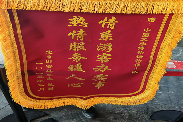 2月16日,一名北京游客將一面“情系游客辦實(shí)事 熱情服務(wù)暖人心”的錦旗送到特保大隊(duì)派駐中國(guó)文字博物館特保中隊(duì),表達(dá)對(duì)特保隊(duì)員不顧恐高、幫助找到墜落無人機(jī)的感激之情。