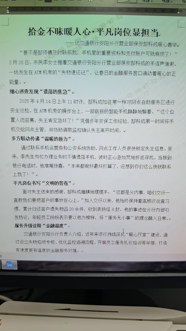 近日,交通銀行股份有限公司安陽分行以《拾金不昧暖人心·平凡崗位顯擔(dān)當(dāng)--記交通銀行安陽分行營業(yè)部保安郜科成暖心善舉》為題在安陽分行內(nèi)部網(wǎng)站發(fā)表文章,對技防分公司保安隊員郜科成給予高度贊揚。