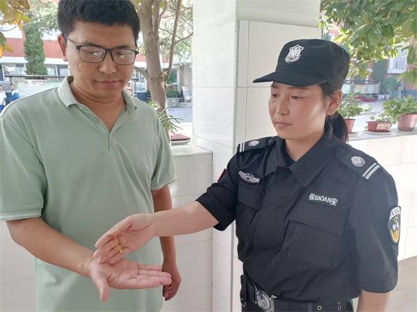 國慶節(jié)放假前夕,安陽市幸福路中學(xué)門口上演了一幕溫暖人心的場(chǎng)景。人防三大隊(duì)派駐該校保安高美麗如往常一樣堅(jiān)守在下午入學(xué)的“護(hù)學(xué)崗”,一邊引導(dǎo)送學(xué)車輛有序通行,一邊提醒學(xué)生安全入校。在疏導(dǎo)完高峰人流后,例行巡查校門口區(qū)域時(shí),于人行橫道旁發(fā)現(xiàn)一條精致的金項(xiàng)鏈,鏈身鑲嵌的吊墜完好無損,初步判斷價(jià)值不菲。