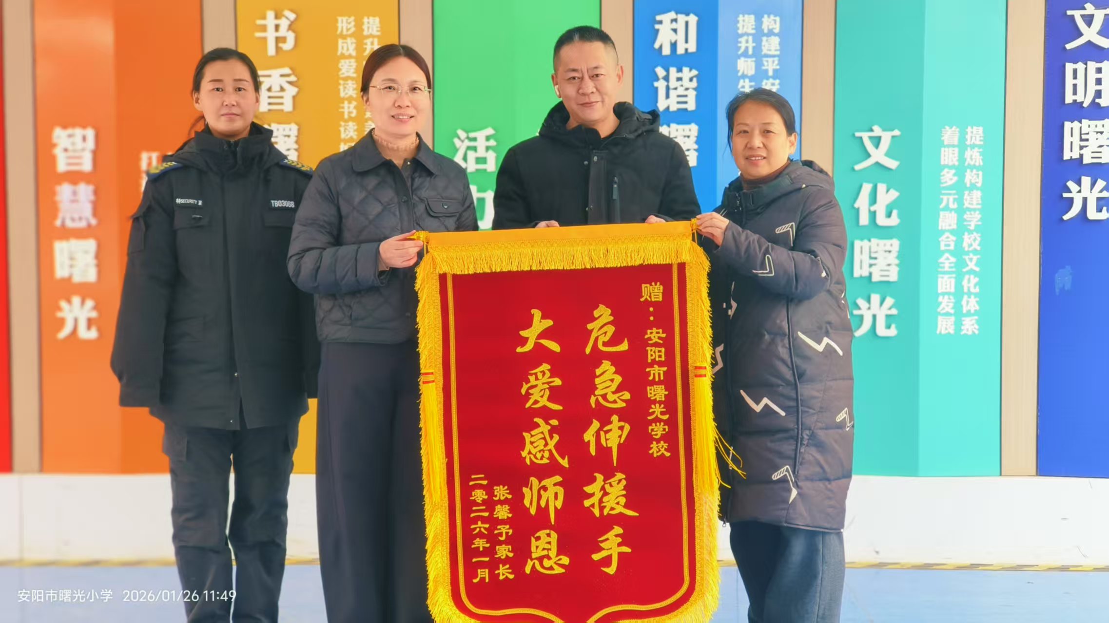 1月26日中午,一面滿載感激的錦旗被送至安陽市曙光學(xué)校,老人家屬緊緊握住校領(lǐng)導(dǎo)的手連連致謝,感謝學(xué)校師生及人防五大隊駐校保安師娟的緊急施救,為老人挽回生命。這份謝意,源于1月23日中午校門口一場與死神賽跑的暖心救援。