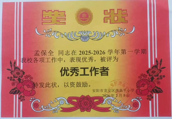 近日,龍安區(qū)西高平小學(xué)召開表彰大會,人防四大隊派駐該校保安員孟保全獲評2025年度優(yōu)秀工作者。他始終秉持“哪里需要就往哪搬”的初心,以一崗多能的服務(wù)、默默堅守的付出,成為師生心中最可靠的 “校園守護者”、最信賴的 “暖心老孟”。