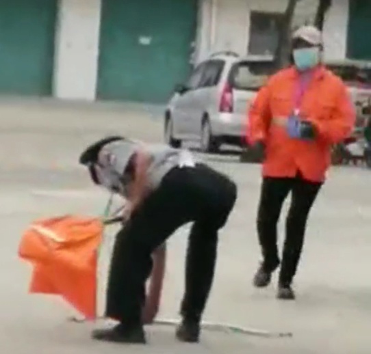 下午2點(diǎn)40許,保潔車經(jīng)過4號(hào)門,路面不平,工具掉落地上,人防二大隊(duì)王紅軍喊停環(huán)衛(wèi)人員,幫其撿起清潔工具。